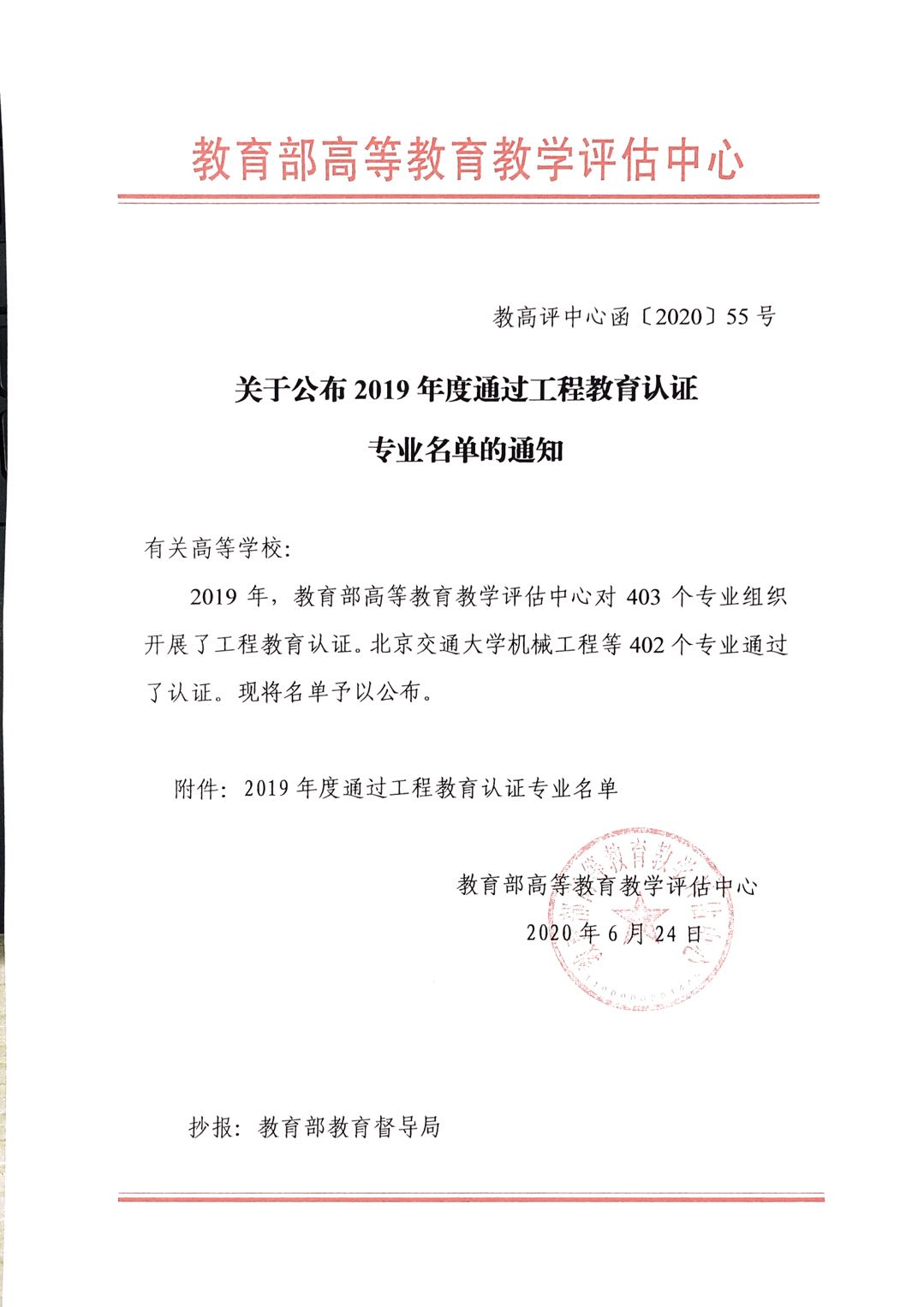 近日,教育部高等教育教学评估中心、中国工程教育专业认证协会正式发布了2019年工程教育专业认证结论。经过学校自评、专家组现场考查、分委员会审议、认证结论审议委员会审议等程序,全国高校共402个专业通过认证。KY官网机械设计制造及其自动化(简称机自)专业顺利通过认证,有效期为6年,即2020年1月至2025年12月。