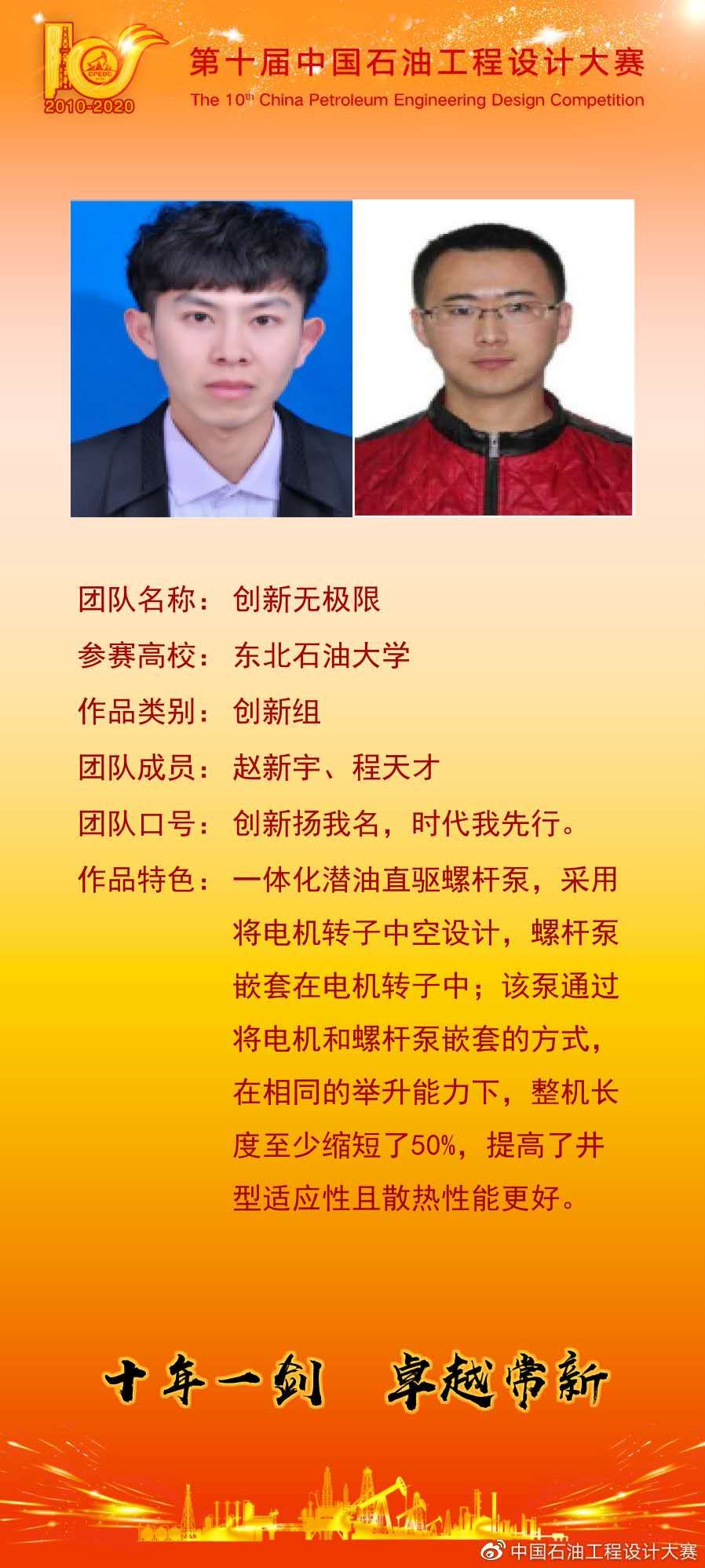 2020年6月13-14日,第十届中国石油工程设计大赛决赛在线上平台顺利举行。共有来自国内27所高校、国外5所高校的5000余名学生和700余名指导教师参与,提交有效作品979份,74支队伍入围全国总决赛。来自中国石油天然气集团公司、中国石油化工集团公司、中国海洋石油集团有限公司和斯伦贝谢公司的61名专家组成专家组,对入围全国总决赛的作品进行评审,评选出一等奖21项,二等奖49项,三等奖4项,KY官网共获方案设计组二等奖6项。其中由KY官网赵新宇和程天才等研究生所完成的“机泵同体潜油直驱螺杆泵”、王中杨和胡金兆等研究生完成的“一体智能高效化精细分注装置”项目获得方案设计类二等奖,董康兴、王宝金两位老师获得优秀指导教师奖。