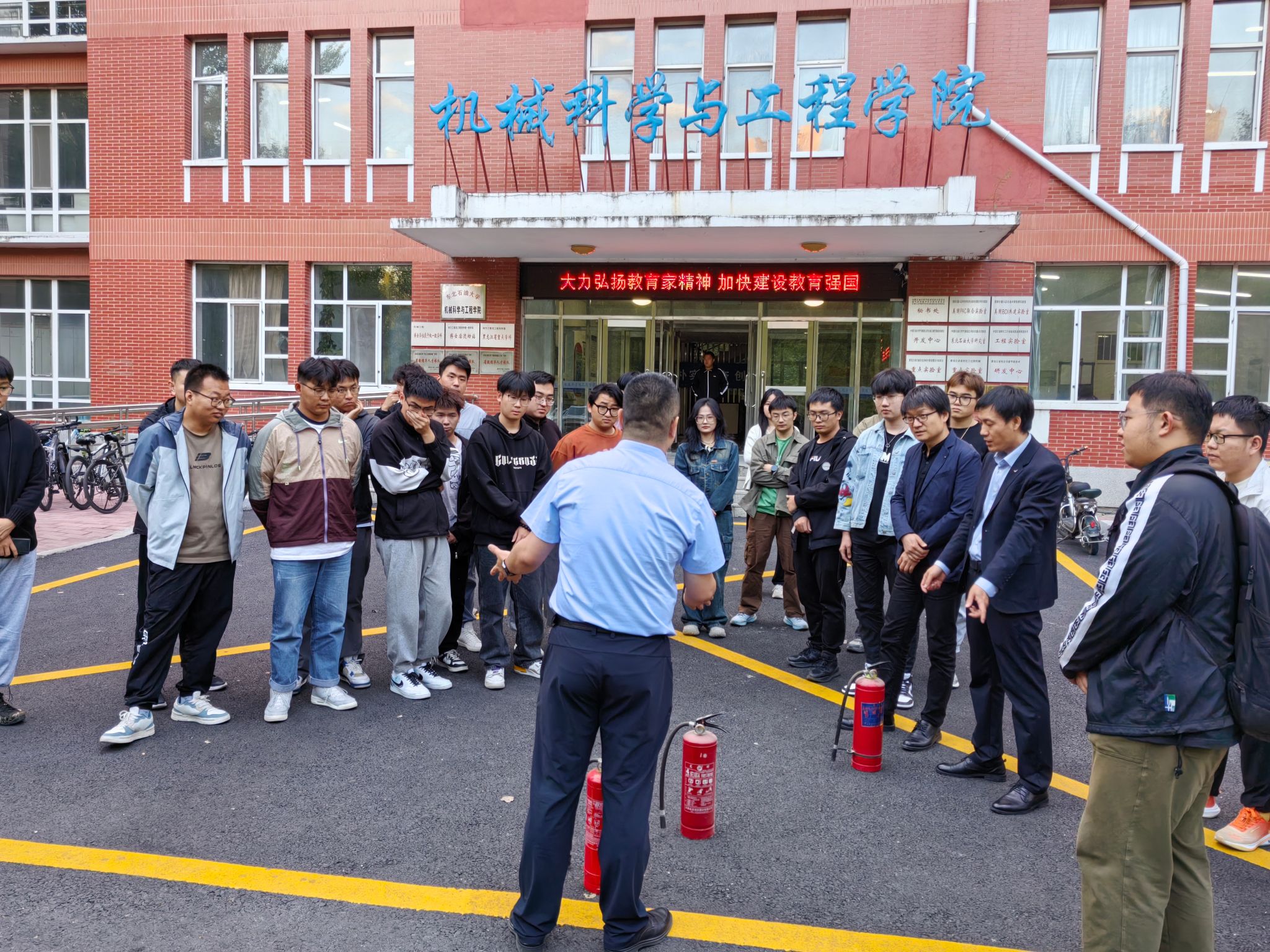 培训后随即开展了实战逃生演练,机电馆内师生在统一指挥下,遵循逃生规范,迅速而有序地通过指定通道安全撤离至馆前安全地带。