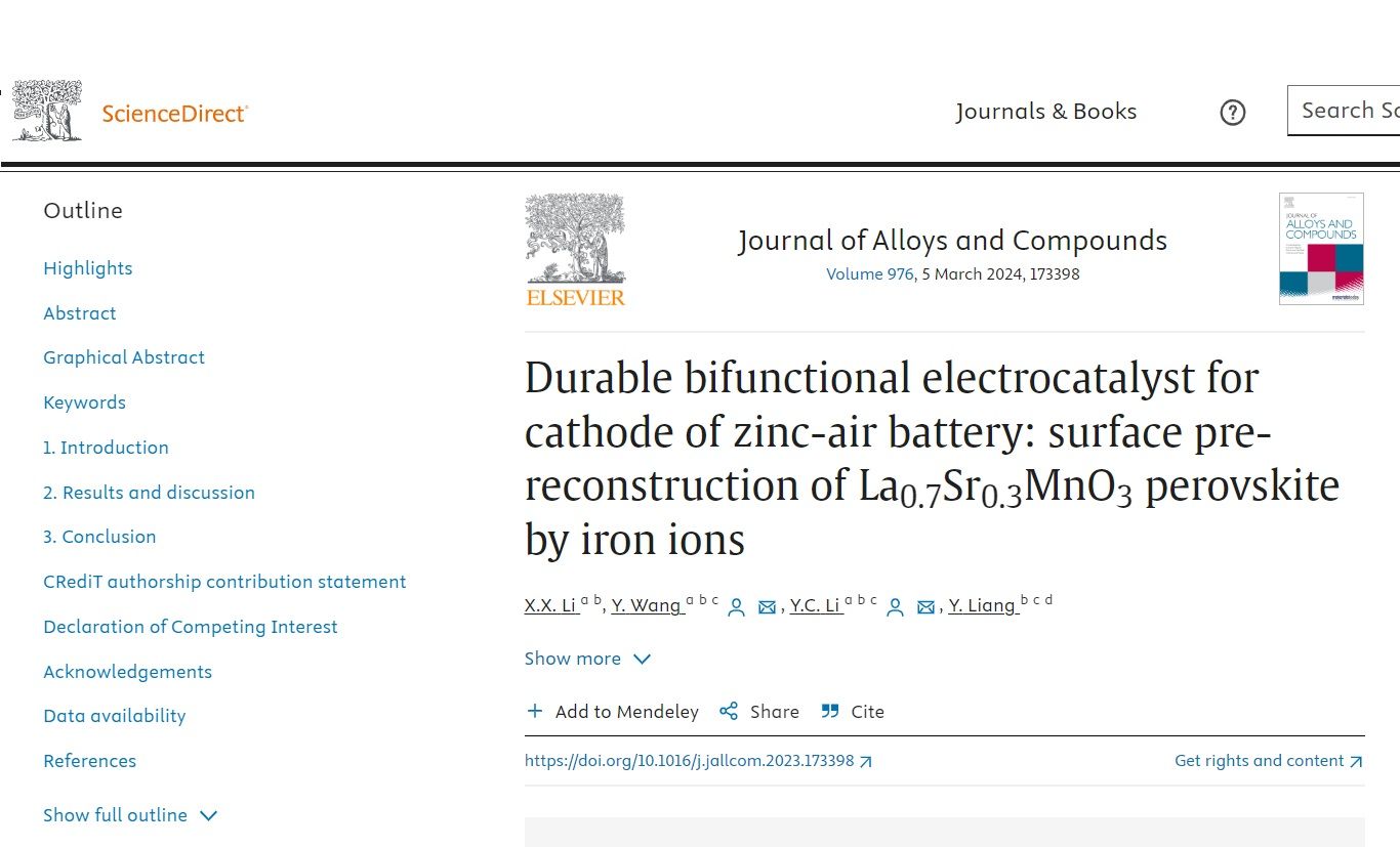 KY官网2021级硕士研究生李肖雄在《Journal of Alloys and Compounds》(IF=6.20, SCI top期刊)上发表题为“Durable bifunctional electrocatalyst for cathode of zinc-air battery: surface pre-reconstruction of La0.7Sr0.3MnO3perovskite by iron ions”的研究论文。(DOI:https://doi.org/10.1016/j.jallcom.2023.173398)。