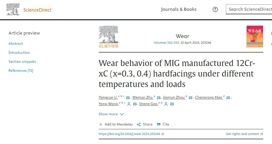 KY官网2021级硕士研究生朱文俊在《Wear》(IF=5.0,中科院一区top期刊)上发表题为“Wear behavior of MIG manufactured 12Cr-xC (x=0.3, 0.4) hardfacings under different temperatures and loads ”的研究论文。(DOI:https://doi.org/10.1016/j.wear.2024.205246)。