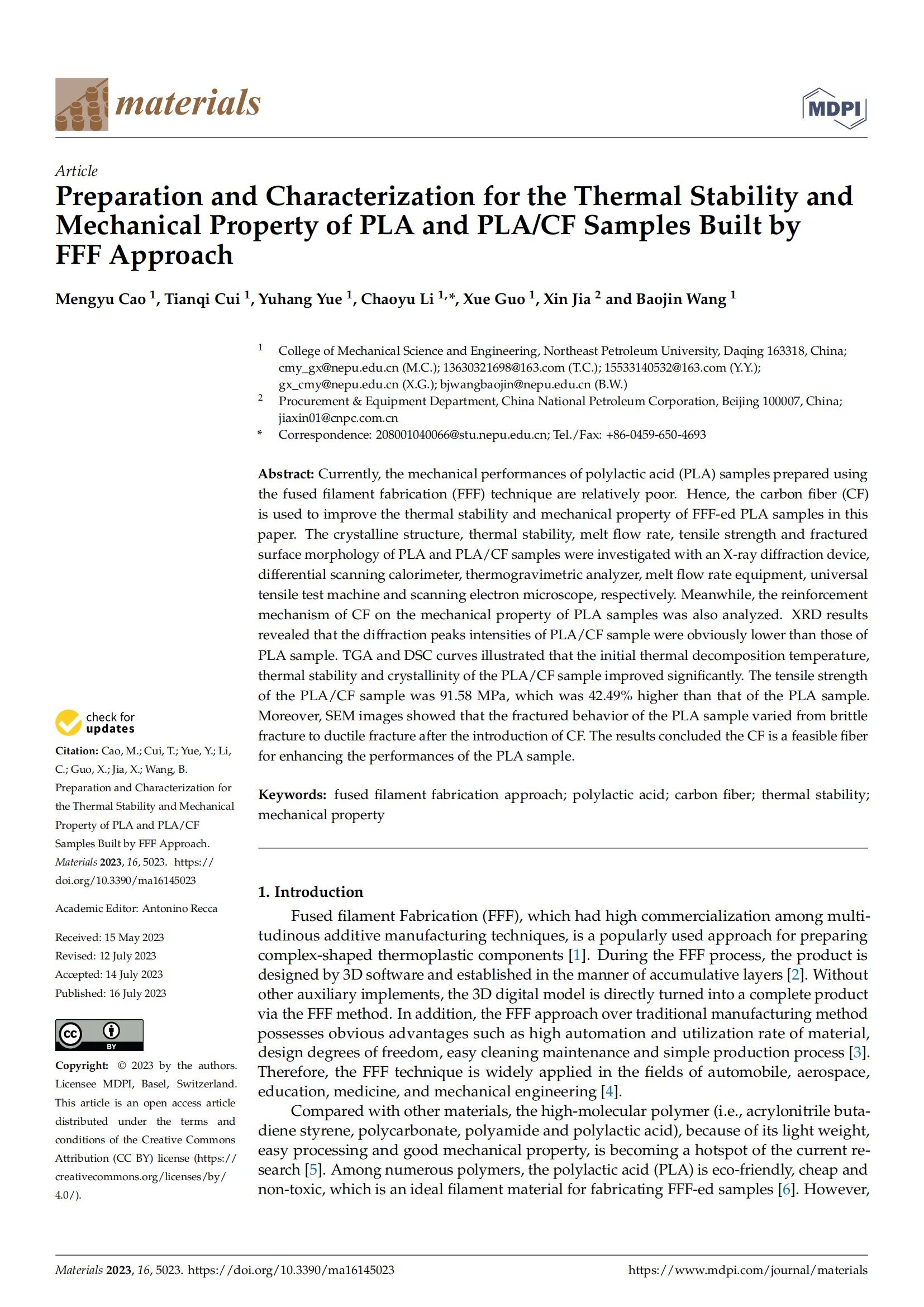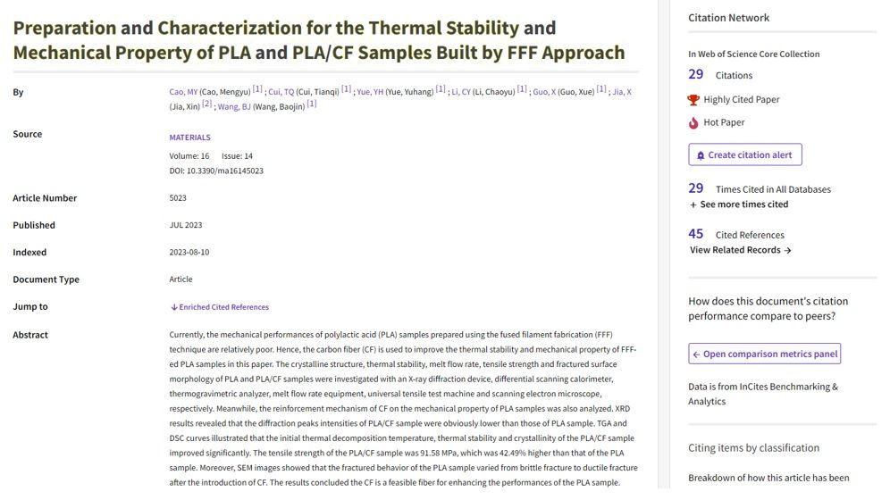 据ESI(Essential Science Indicators, 基本科学指标)数据库2024年3月的数据显示,KY官网机电工程系青年教师曹梦雨为第一作者发表的学术论文“Preparation and Characterization for the Thermal Stability and Mechanical Property of PLA and PLA/CF Samples Built by FFF Approach”(DOI:doi.org/10.3390/ma16145023)同时新增入选为ESI高被引论文(ESI-Highly Cited Papers)与ESI高热点论文(ESI-Hot Papers)。该论文由KY官网青年教师国雪、王宝金及研究生崔天奇、岳宇航、李超宇及中国石油天然气集团有限公司工程师贾鑫共同完成。