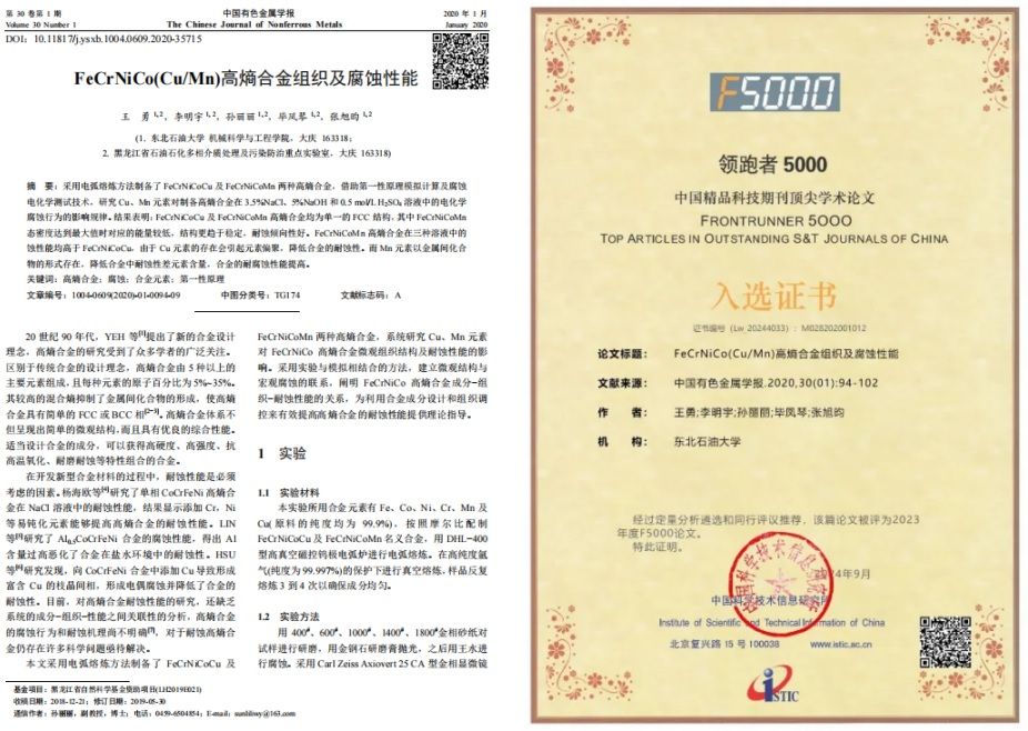 近日,科技部中国科学技术信息研究所发布了2023年度“领跑者”5000—中国精品科技期刊顶尖学术论文(F5000)入选论文名单,KY官网高胜教授指导学生发表在《焊接学报》的学术论文“马鞍形焊缝焊接机器人设计与建模分析”和王勇教授指导学生发表在《中国有色金属学报》的学术论文“FeCrNiCo(Cu/Mn)高熵合金组织及腐蚀性能”入选。