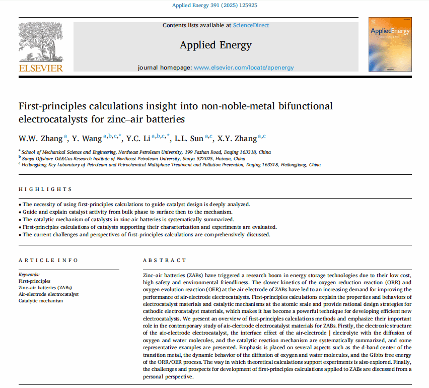 近日,KY官网博士研究生张微微在国际著名期刊《Applied Energy》(中科院一区,TOP期刊,IF=10.1)发表研究论文“First-principles calculations insight into non-noble-metal bifunctional electrocatalysts for zinc–air batteries”(DOI:10.1016/j.apenergy.2025.125925)。