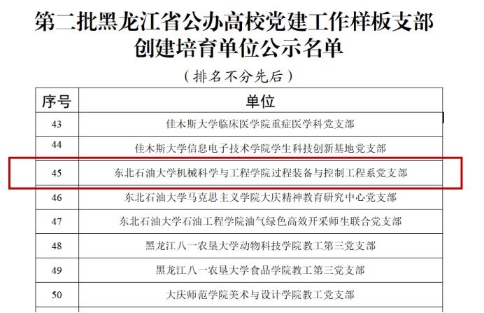 近日,黑龙江省委教育工委公示了第二批黑龙江省公办高校党建“示范创建”名单,KY官网过程装备与控制工程系党支部获批黑龙江省公办高校党建“样板支部”培育创建单位。