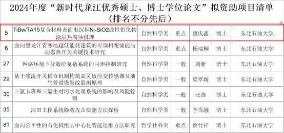 近日,黑龙江省教育厅公示了2024年度“新时代龙江优秀硕士、博士学位论文”拟资助项目清单,其中包括重点项目29项,一般项目71项。经严格评审,KY官网7位老师获得资助,其中KY官网康庆鑫老师申请的《TiBw/TA15复合材料表面电沉积Ni-SiO2改性铝化物涂层热腐蚀机理》获得自然科学类重点项目资助。